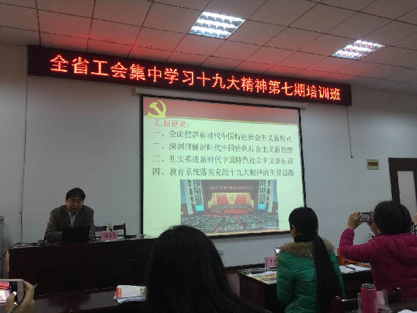2017年12月4日,全省教育系统2017年工会女工干部培训班在湖北省工会干部学校开班。开班仪式上,湖北省教科文卫体工会副主席李斌同志出席并讲话。此次培训班授课内容丰富,包括十九大精神集中学习,有专家对十九大精神的讲解,还有十九大党代表蒋扣分同志为大家作报告,同时还请来各方面的专家对此次女工培训班开展女工知识讲座,学员们纷纷表示受益匪浅。