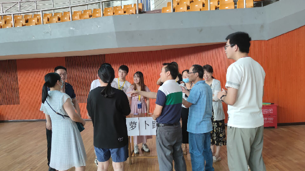 在传声筒游戏中,5名师生团结合作,手舞足蹈地向下一位队友传达题目信息,趣味横生。乒乓球绕桩考验着参与者的协调性和平衡力,师生们跃跃欲试,向终点冲刺。在歌词接龙游戏环节,参与者一展歌喉,将气氛推向高潮,场内歌声不断,热闹非凡。投壶游戏倍受师生们的喜爱,很多老师进行多次尝试后依然觉得意犹未尽。每个项目完赛后均可在集章卡片上盖章,凭盖章次数分别领取相应的小奖品。