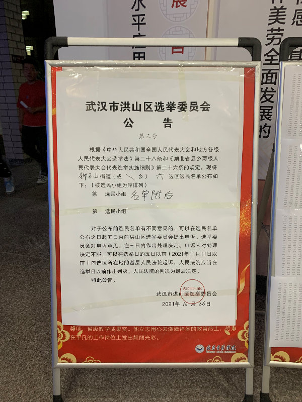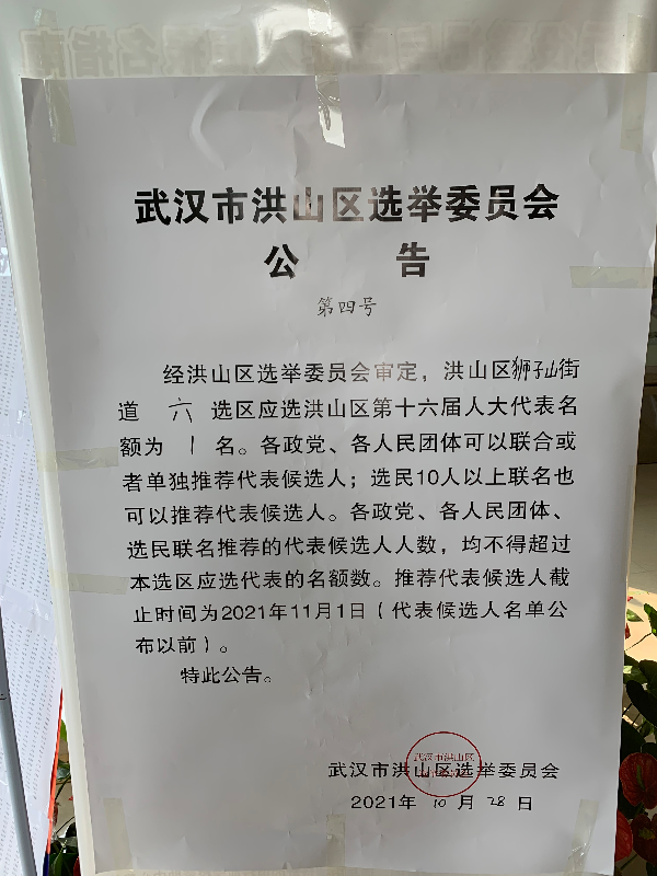 10月28日,接武汉市洪山区人民政府狮子山街道办事处通知,于当日上午10点张贴武汉市洪山区选举委员会公告第四号。