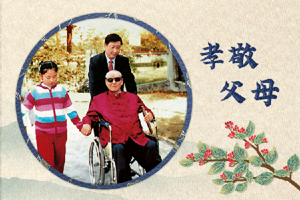 习近平孝敬父母,尽管公务繁忙,每当有时间他都会拉着母亲的手散步、聊天,春节不能和父母团聚,会用电话诉说愧疚、表达孝心。他的书架上摆着两张照片:一张是他与家人陪坐在轮椅上的父亲散步,另一张是他牵着母亲的手在院子里漫步。孝亲、敬老,体现在细微之处。